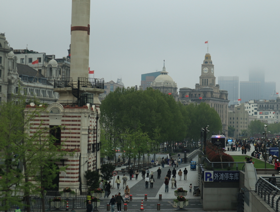 外滩游人如织。记者将一张印有上世纪万国建筑群的明信片举起,与眼前的万国建筑群对比。明信片中多了一座和平女神纪念碑。