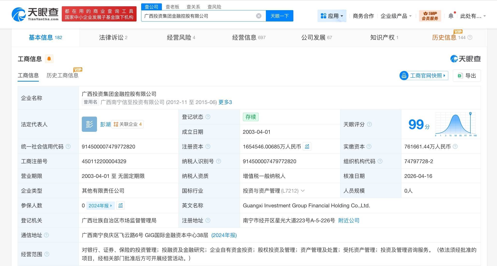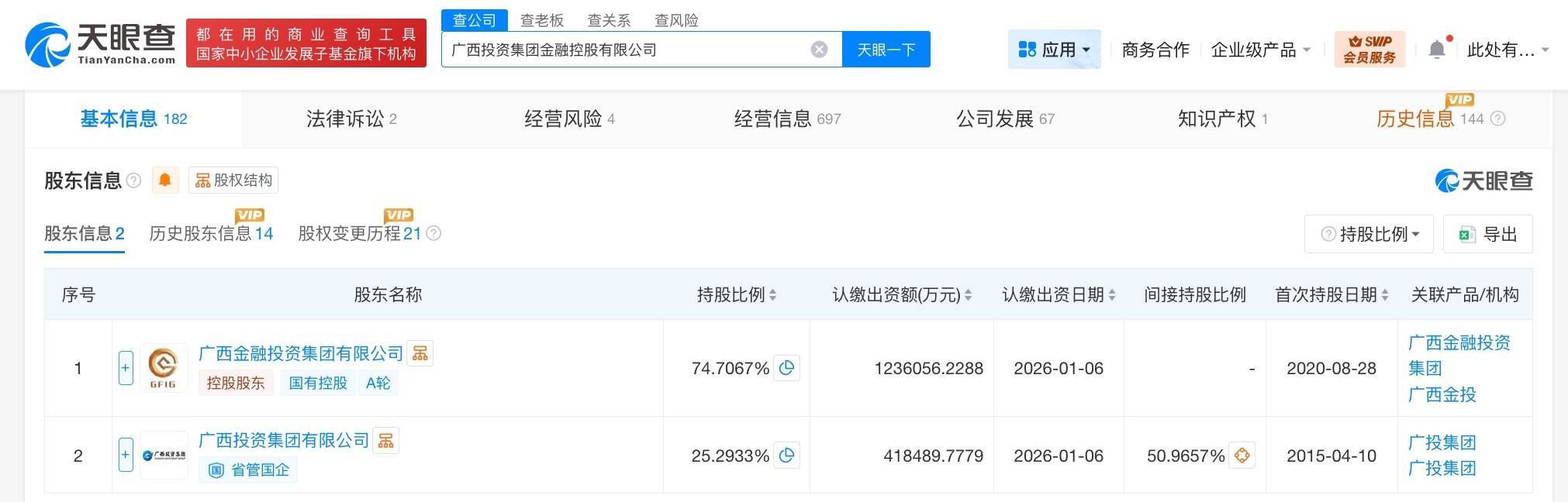 南方财经4月21日电,天眼查App显示,近日,广西投资集团金融控股有限公司发生工商变更,注册资本由约153.8亿人民币增至约165.5亿人民币,增幅约8%。该公司成立于2003年4月,法定代表人为彭湖,经营范围包括对银行、证券、保险的投资管理,投融资及金融研究,企业自有资金投资,股权投资及管理等。股东信息显示,该公司由广西金融投资集团有限公司、广西投资集团有限公司共同持股。