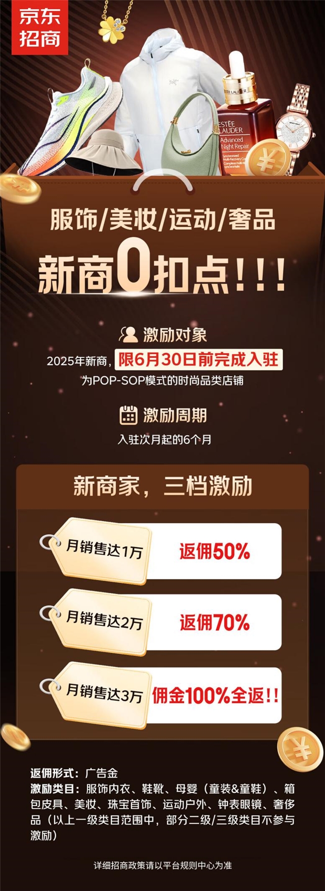 此次激励政策针对2025年6月30日前入驻的新商家,覆盖男女装、美妆、运动鞋服、内衣、箱包配饰、鞋靴、户外装备、童装童鞋、钟表眼镜、奢品等时尚品类,通过“多卖多返”的阶梯式返佣机制,为商家带来全方位的费用返还。