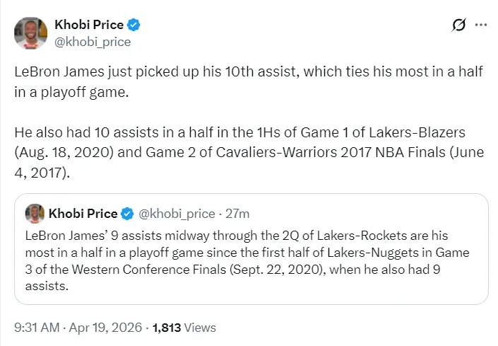 北京时间4月19日,NBA季后赛首轮G1,湖人以107-98击败火箭。这场比赛41岁的勒布朗生涯第293次出战季后赛,他首节就送出8次助攻,半场送出10次助攻,勒布朗努力的态度感染了全队,最终41岁的他拿到19+13+8带队取胜。