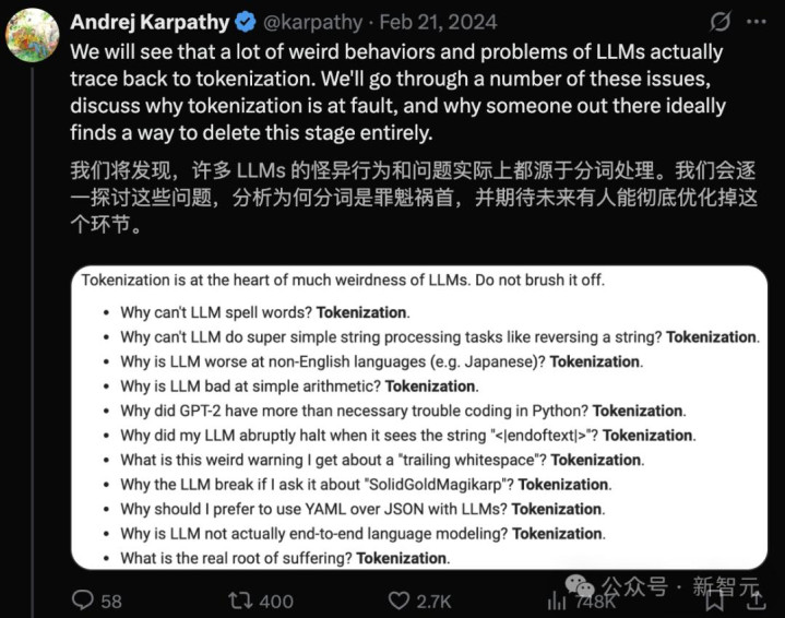 特别是最后一点,Karpathy忍了很久了,早就多次吐槽分词器太烂了——