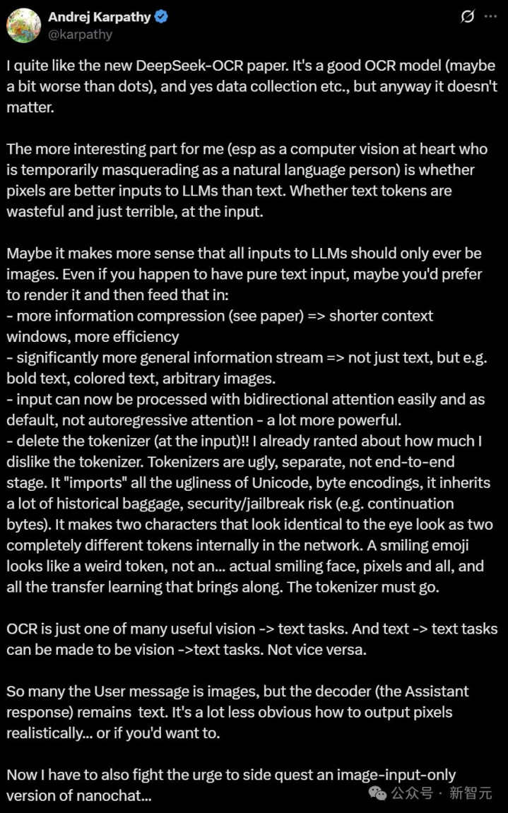 Karpathy相当喜欢DeepSeek-OCR的新论文。