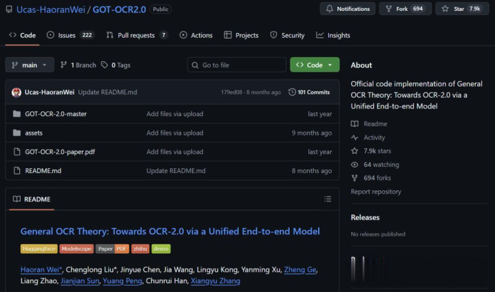 论文一作Haoran Wei,此前也是GitHub 7.9k星爆火项目GOT-OCR2.0,即「General OCR Theory: Towards OCR-2.0 via a Unified End-to-end Model」的一作。