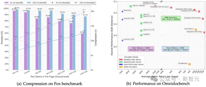 一整页密密麻麻的文本,被压成仅仅100个视觉Token,在 OmniDocBench上实现最多60倍压缩!