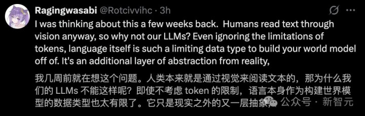 但更有趣的部分在于,对于大语言模型来说,像素输入是否优于文本输入?在输入端,文本Token会不会是一种既浪费又糟糕透顶的方式?
